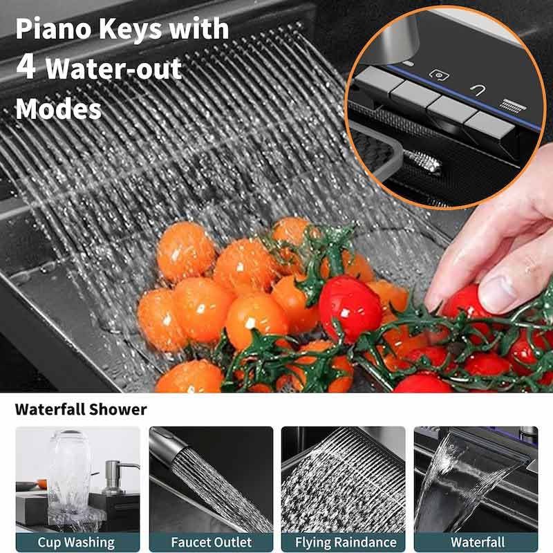 stainless steel kitchen sink,kitchen faucet,strainer,drain pipe,cutting board,draining basket,angle valve*2,hot and cold water pipes,soap dispenser.