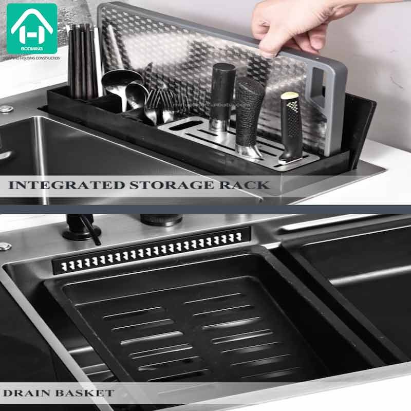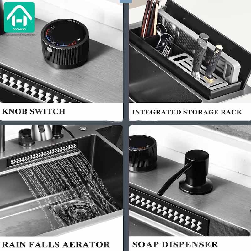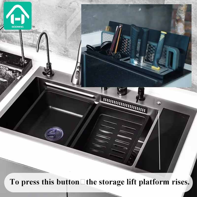 Accessories included in the Kitchen Sink:Sink,Table Control,Small Basin,Draining Basket,Cutting Board,Valve, Waterfall Faucet,Automatic Height-adjustable Storage Platform, etc...,