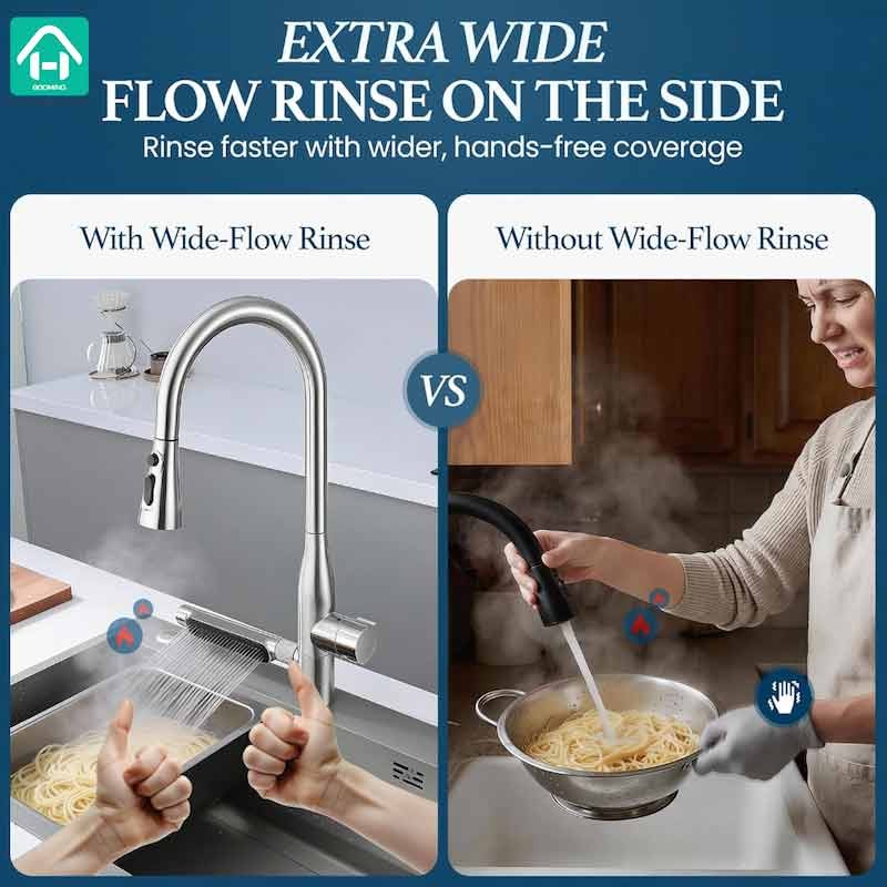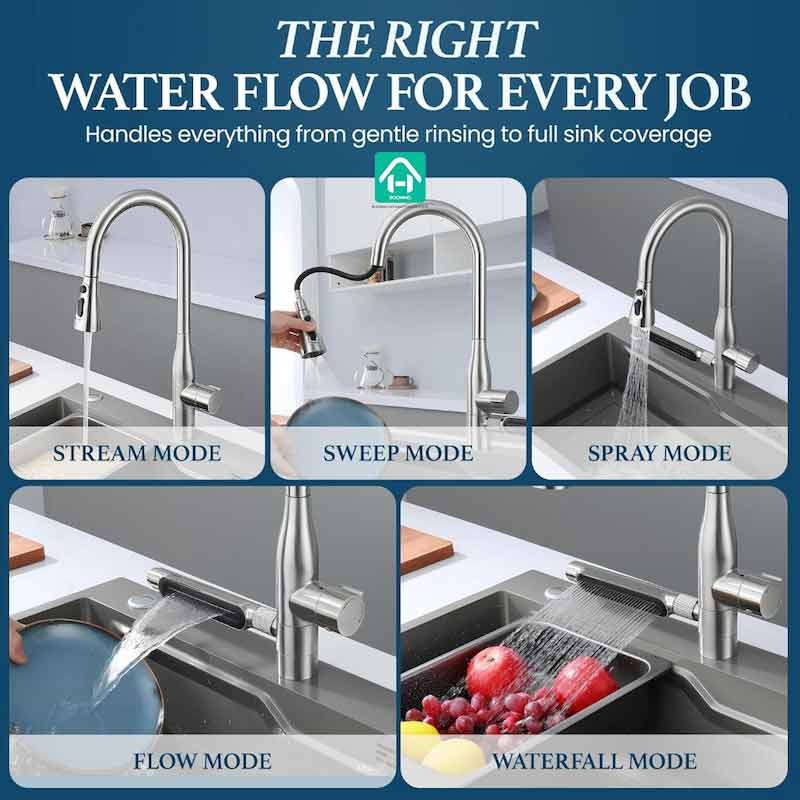 Feature of Pull Down Kitchen Faucet: Lead Free,5 Water Outlet Modes: waterfall mode, stream mode, sweep mode, spray mode, flow mode,360° Swivel Spout